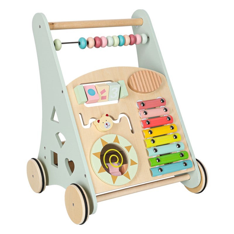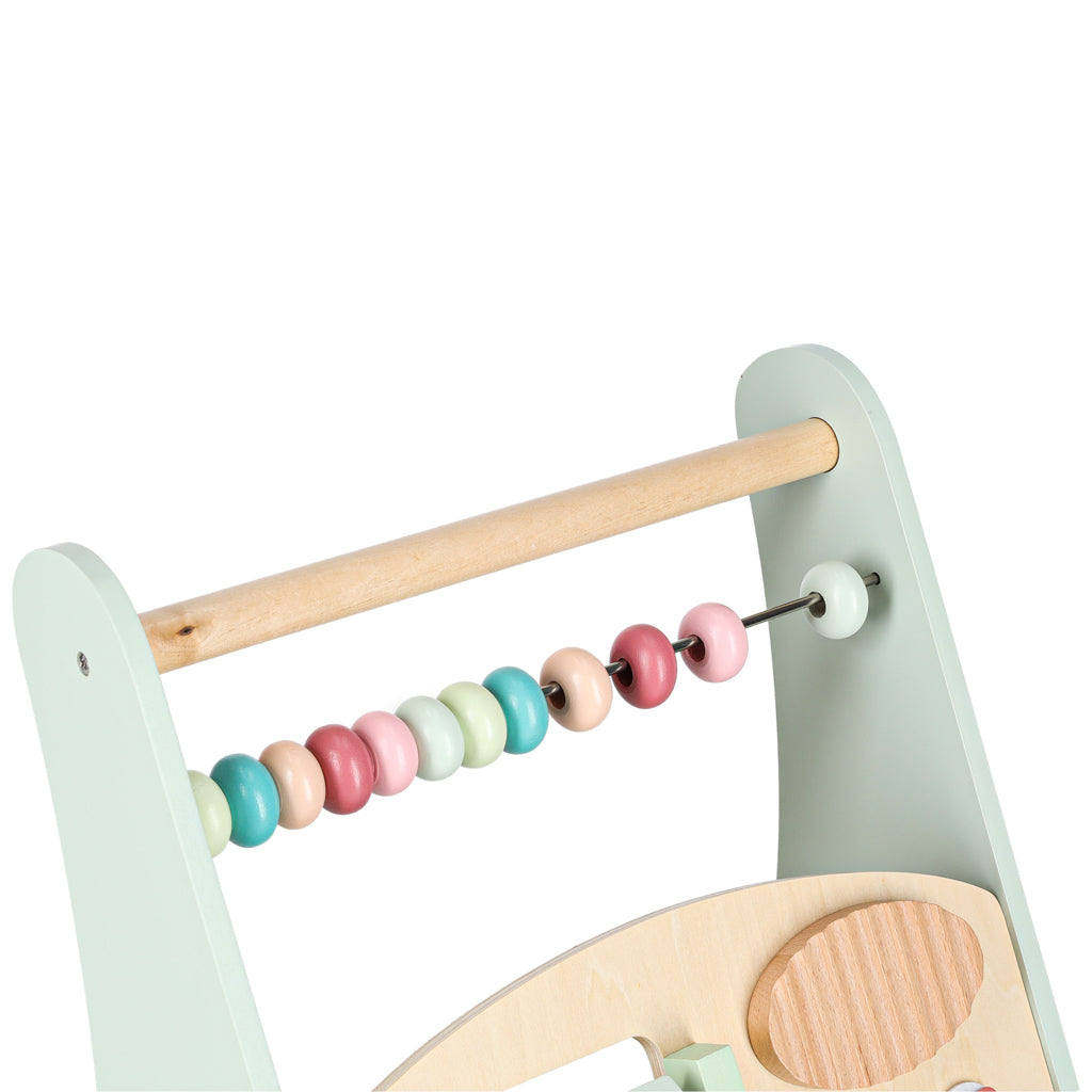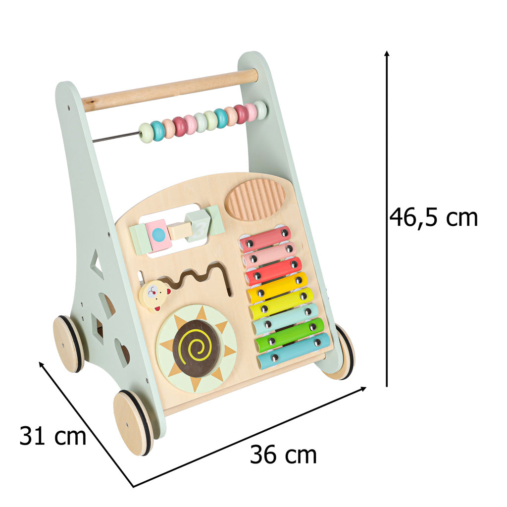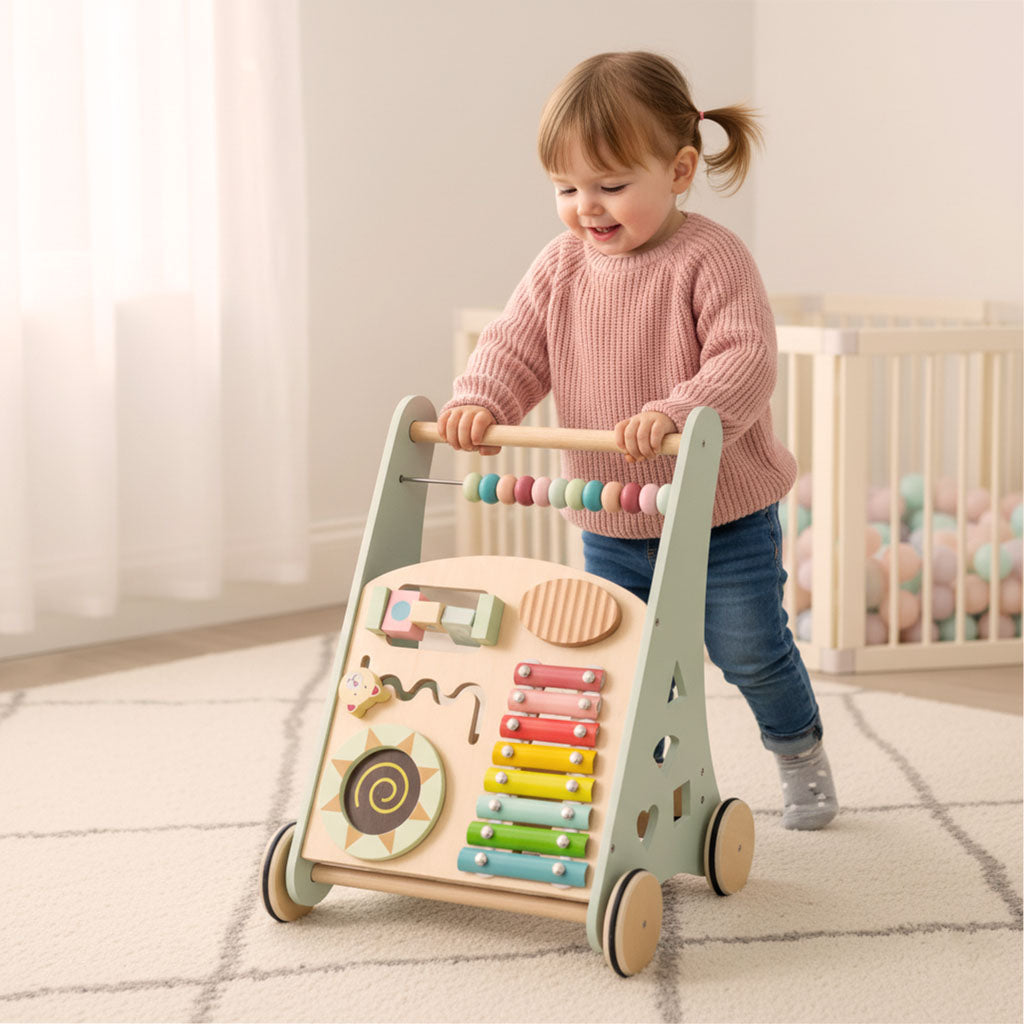 Izglītojošais koka staigulis un aktivitātes centrs atbalsta staigāšanas apguvi, attīsta maņas un motivē iepazīt pasauli caur kustību