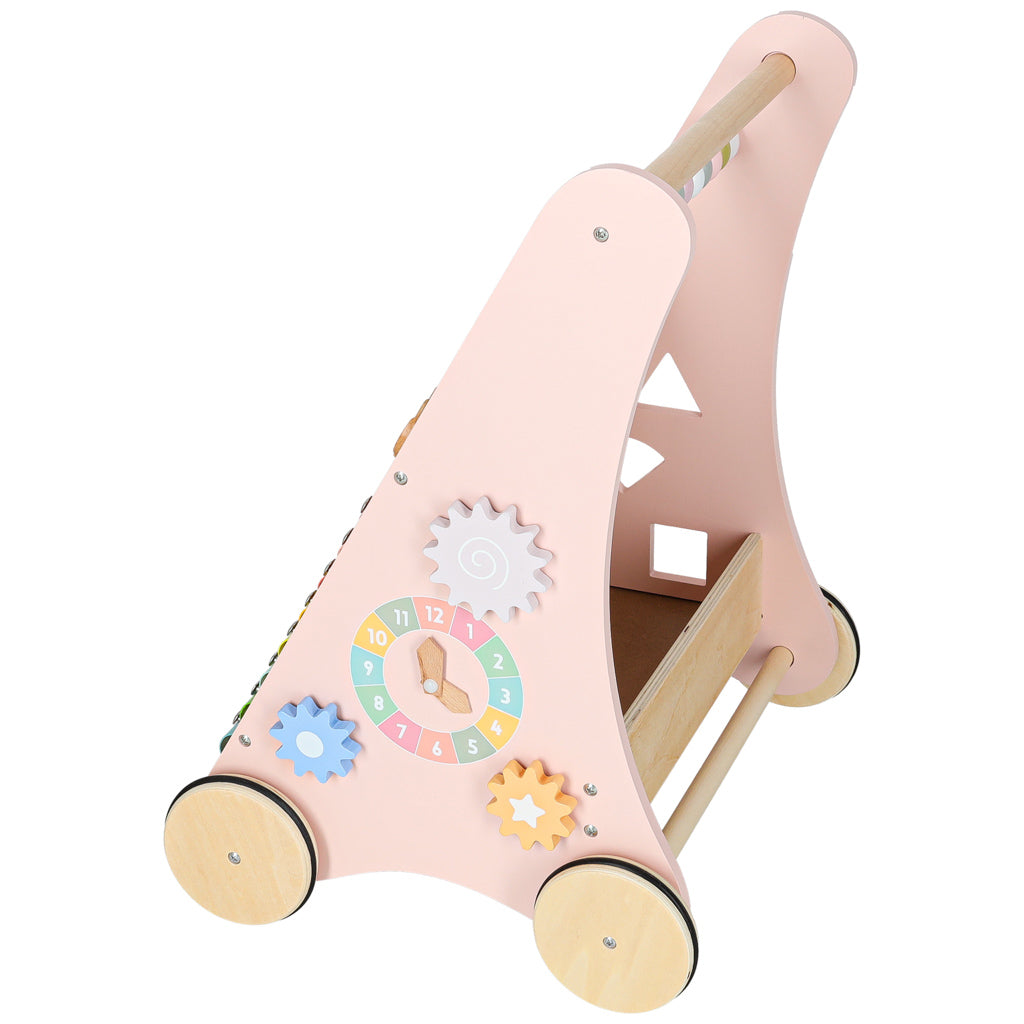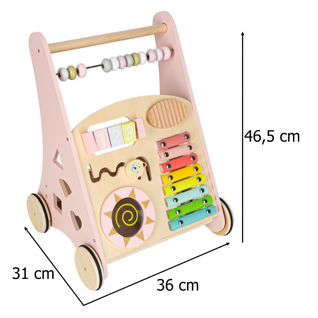 Izglītojošais koka staigulis un aktivitātes centrs atbalsta staigāšanas apguvi, attīsta maņas un motivē iepazīt pasauli caur kustību