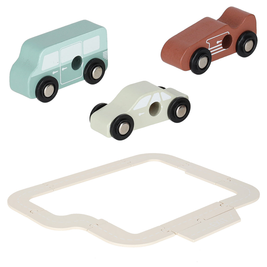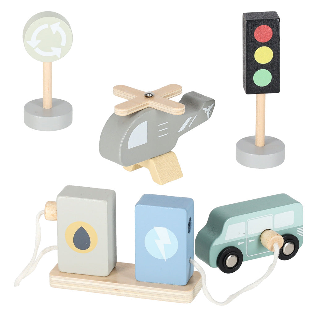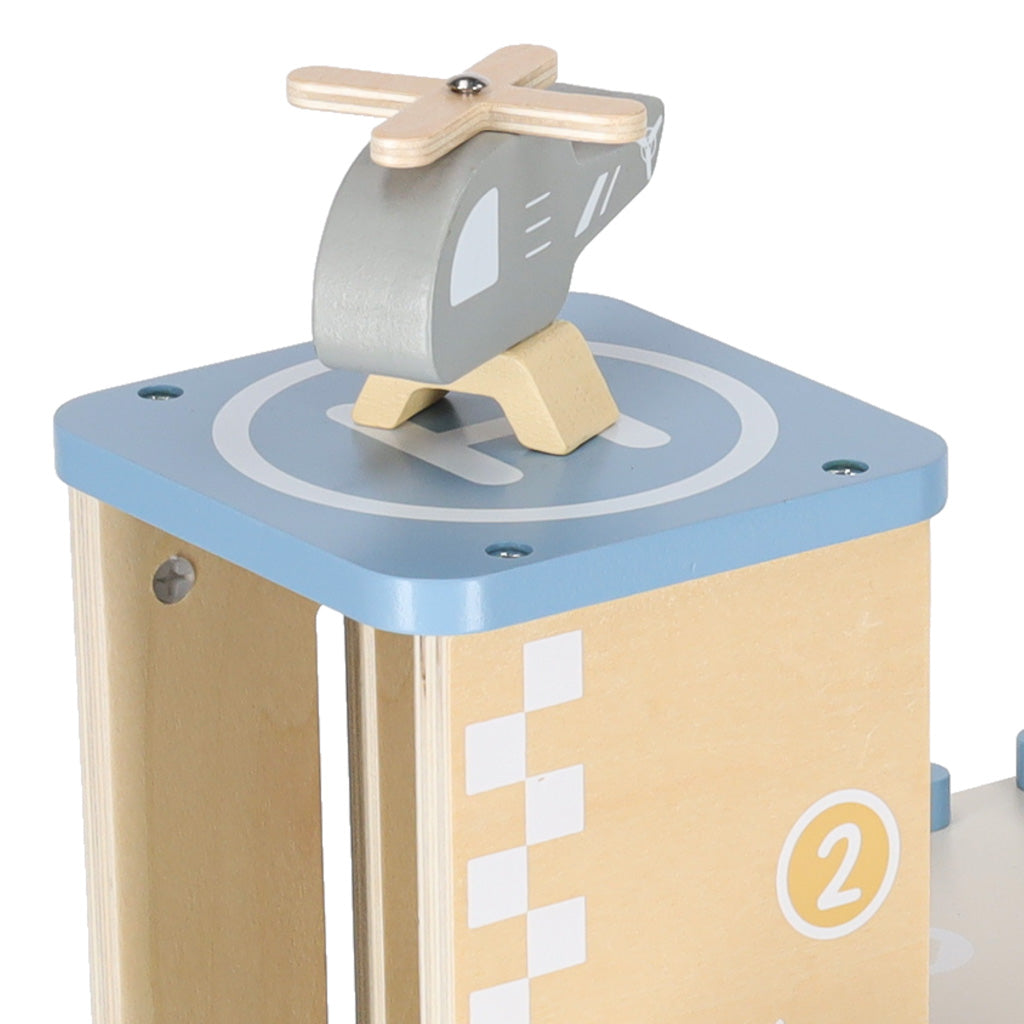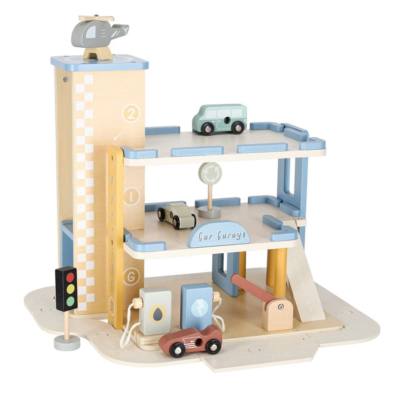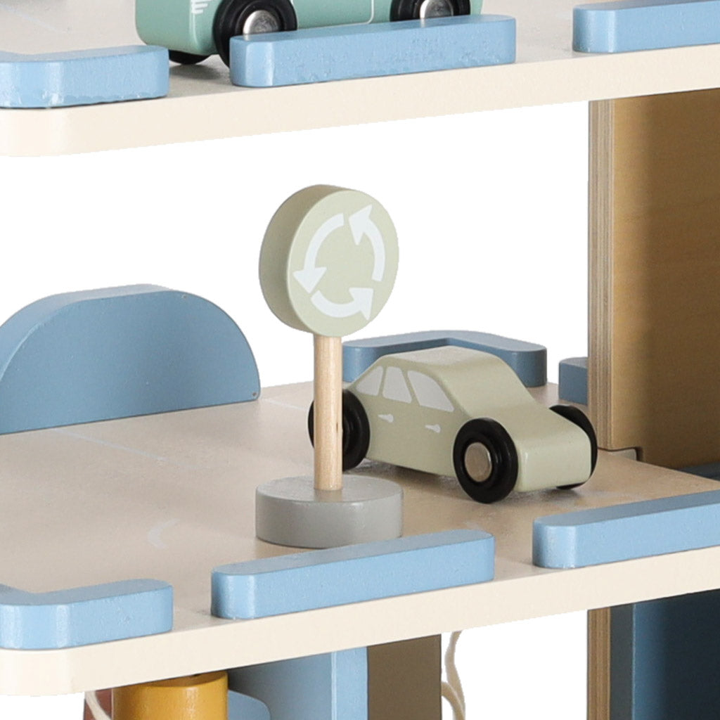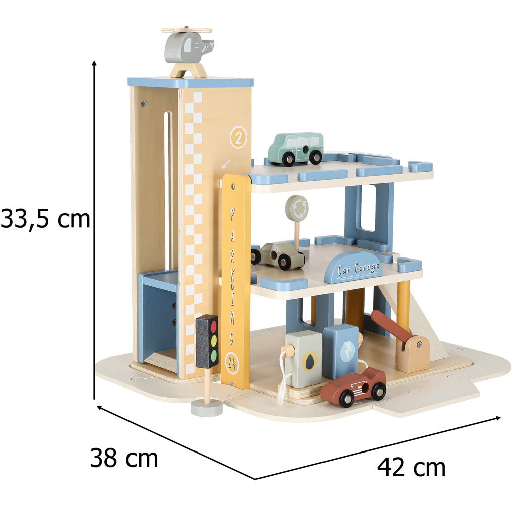 Burvīga koka autostāvvieta, kas apvieno divstāvu garāžu ar degvielas uzpildes staciju - ideāls komplekts mazajiem auto un būvniecības entuziastiem!