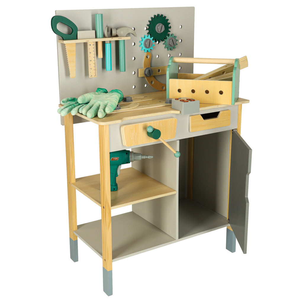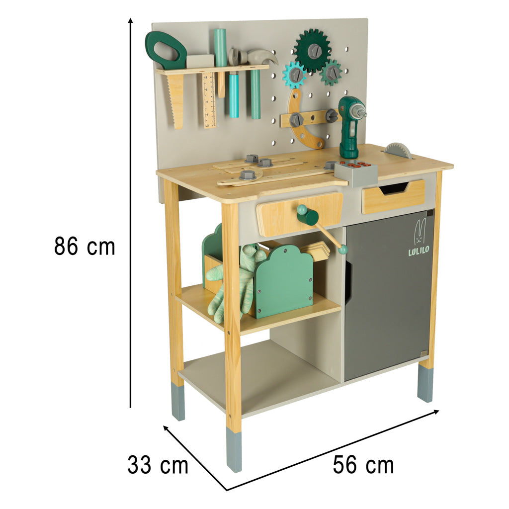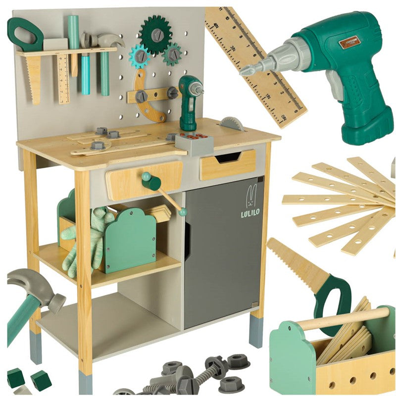 Lulilo koka instrumentu darbnīca mazajiem strādniekiem ar instrumentiem, zāģi, skrūvgriezi un skaņu efektiem