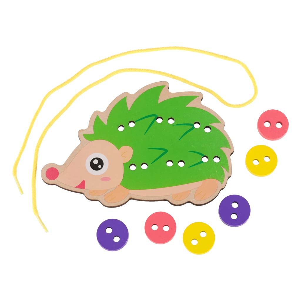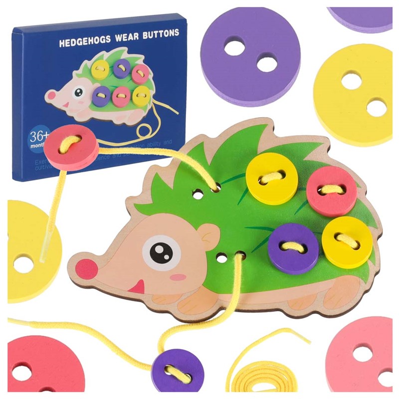 Bērna uzdevums ir izvērt aukliņu caur krāsaino pogu caurumiem un piestiprināt tās pie ezīša